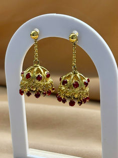 Brass, Gold plated Red stone kudu earrings | L 1.5”