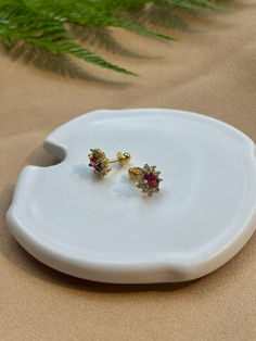 Gold plated red cubic zircon ear studs | H 1cm